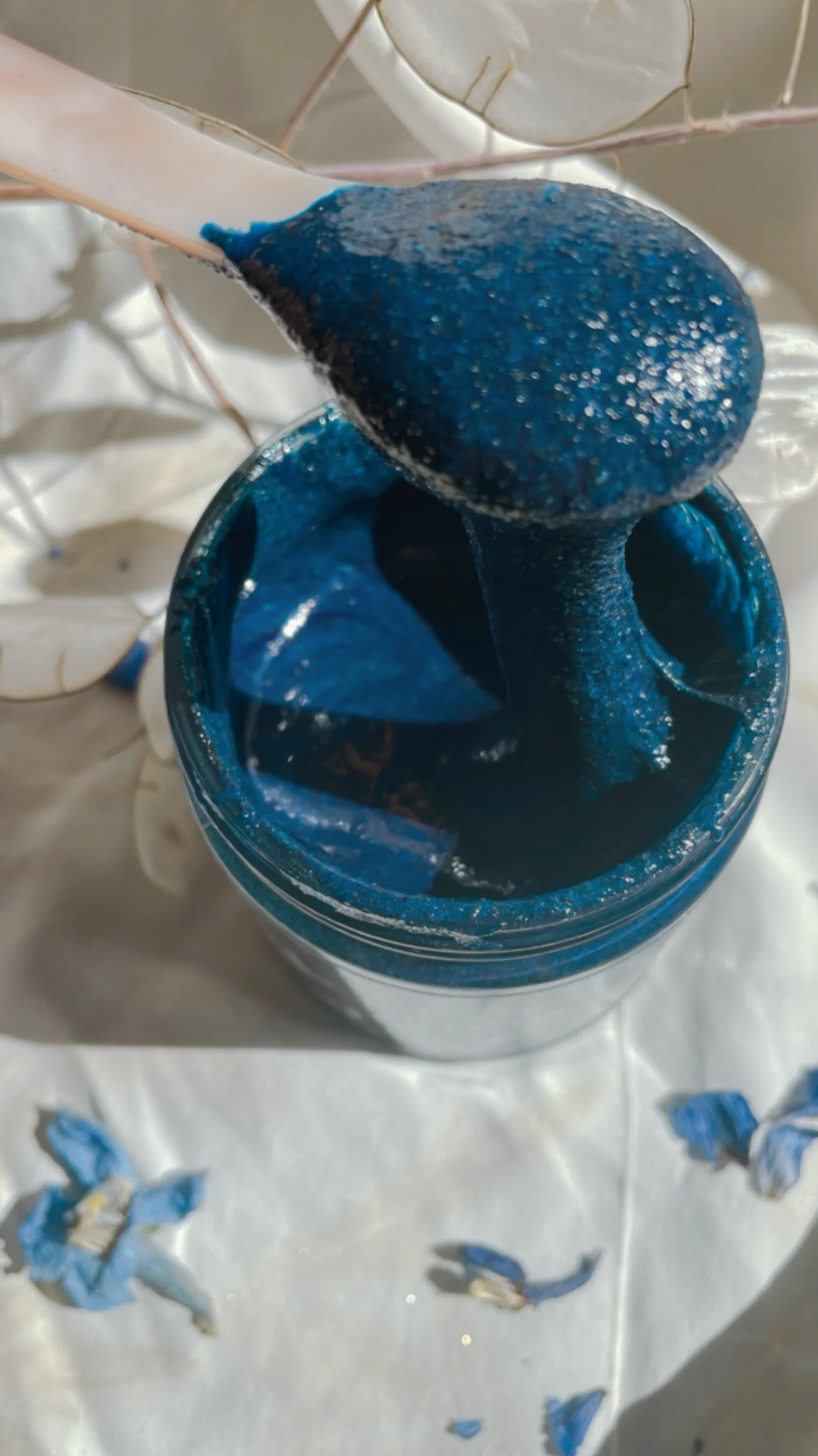 ingredients:. freeze dried blueberries, tulsi vana, tulsi kapoor, spruce tips, fir tips, cacao nibs, green cardamom, butterfly pea flower, ceylon cinnamon, cornflower petals, cloves, peppermint, blue lotus petals. everything is organic and ethically sourced